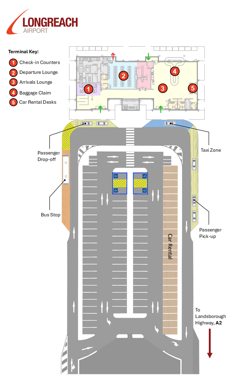 Find your way around Longreach Airport with ease. The map shows check-in, baggage claim, car rentals, parking, and passenger pick-up and drop-off zones all in one handy view.